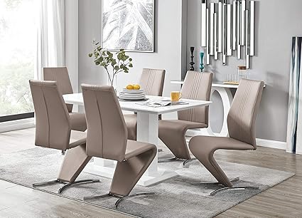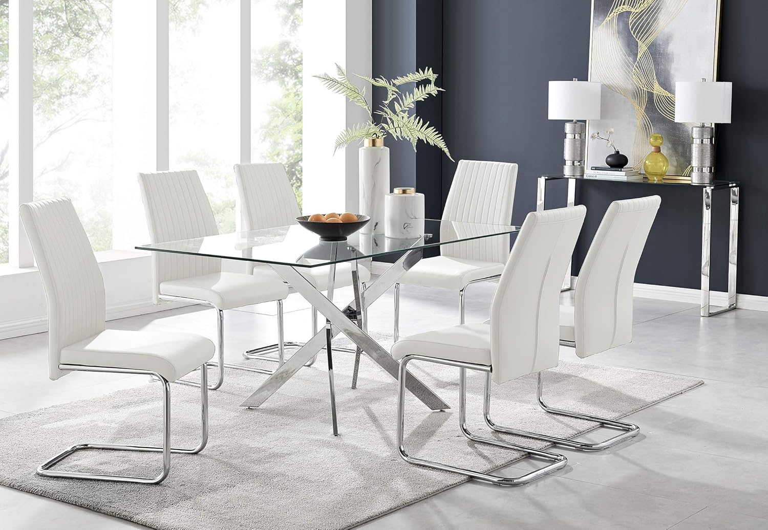 Lovely quality round / oval extending dining table with white gloss and stainless steel base with 6 well padded ice grey faux leather chairs. You also get four white chairs each with a unique modern design and impeccable comfort levels. Chairs glass table top protector 160c. Beautifully crafted and reasonably priced, find the perfect table for you today. Ids online deluxe glass dining table set 7 pieces modern design with faux leather chair elegant style anti dirt, white. A 6 seater dining table is the ideal solution for larger households and social butterflies alike and we have a great selection of beautiful designs that will make the perfect focal point to be proud of in your home's dining room. Full white glove delivery and assembly, including removal of packaging. Includes dining table, 1 dining bench and 2 dining chairs. Shop with afterpay on eligible items. Find great deals on ebay for glass dining table and chairs. Free delivery and returns on ebay plus items for plus members. Argos home lido glass dining table & 4 grey chairs. With the assi white and grey gloss the extension mechanism for this dining table is neatly concealed within the design of the table so it is out of sight.